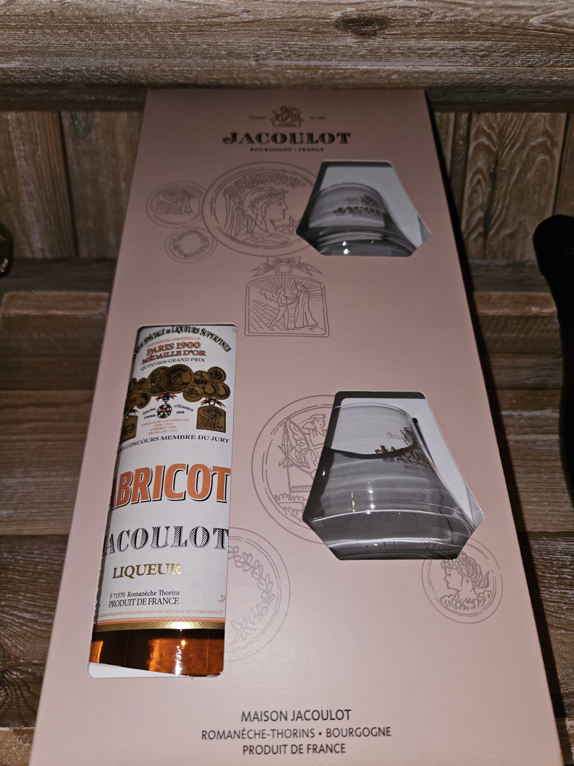 Coffret abricot"Jacoulot" (70cl) + 2 verres